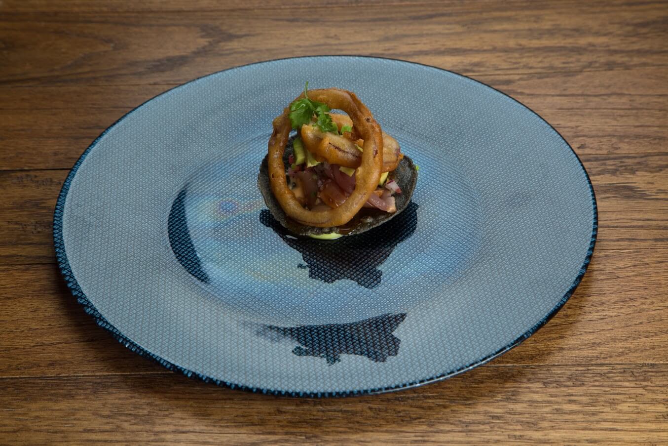 Blinis de salmón ahumado, relish de piña y salsa de ostión.