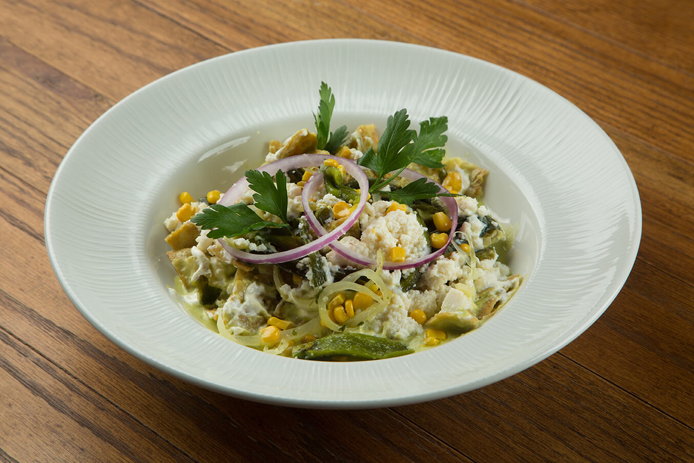 Quesadillas fritas de chicharrón prensado, huitlacoche, flor de calabaza, queso.